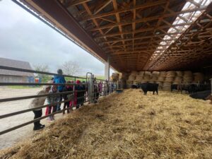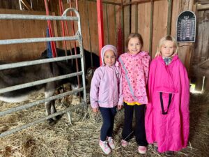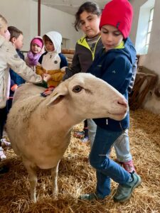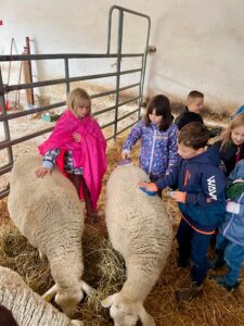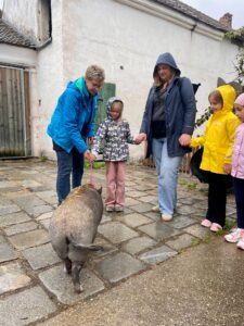 Dort wartete ein spannender Vormittag: Die Kinder konnten viele Tiere kennenlernen – von Eseln, Ponys, Hühnern und Hängebauchschweinen bis hin zu Rindern und Schafen. Besonders aufregend war es, die Schafe selbst zu striegeln und zu erleben, wie zutraulich die Tiere sind. Auch die Hängebauchschweine sorgten für Begeisterung, als sie kleine Tricks zeigten.